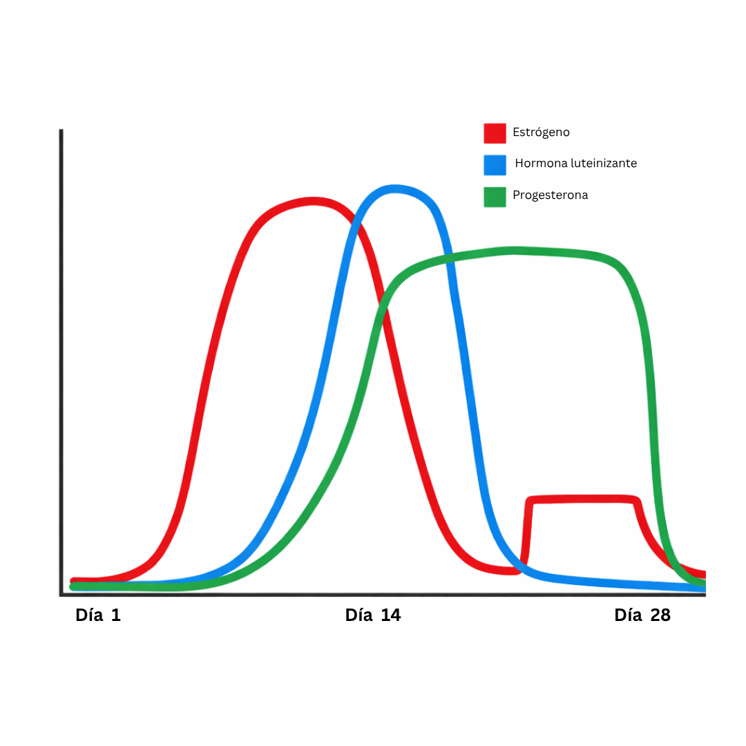 El ciclo menstrual está guiado por varias hormonas que trabajan juntas para preparar el cuerpo para un posible embarazo. Las tres hormonas que se muestran en la gráfica son el estrógeno, la progesterona y la hormona luteinizante (LH).